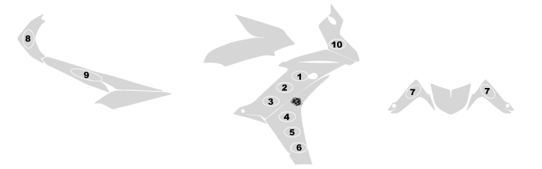 Rear cover / Front cover (for sports) / Radiator cover (for roadsters) / Tank / Front panel / Front fender / Additional parts (for some models)