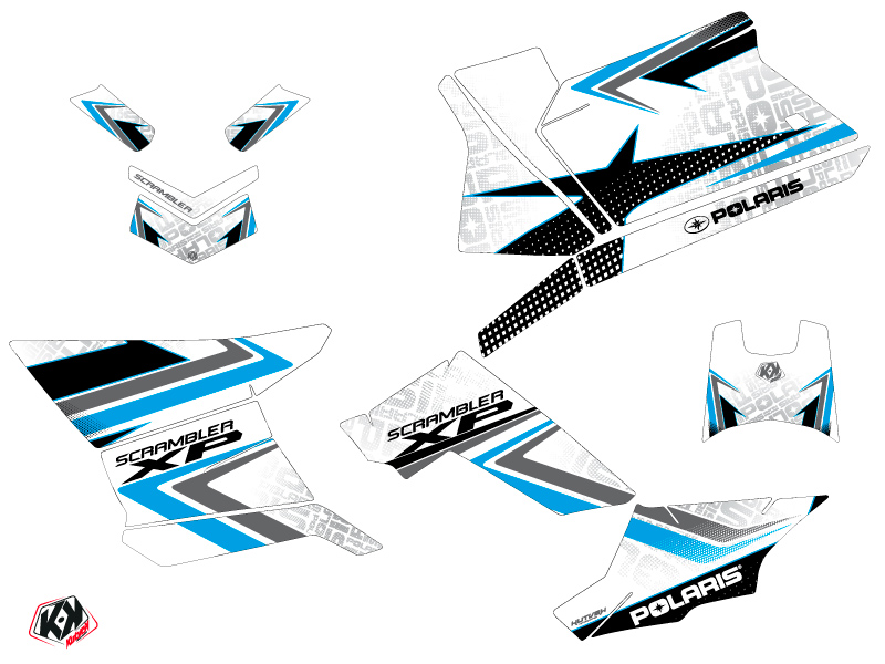 Offer you now for your Polaris Scrambler 850-1000 XP ATV a graphic kit on the colors and brand name of ROCK White Blue.