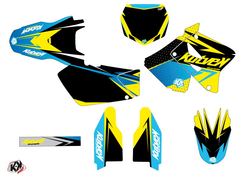 Offer you now for your Suzuki 125 RM Dirt Bike a graphic kit on the colors and brand name of STAGE Yellow Blue.