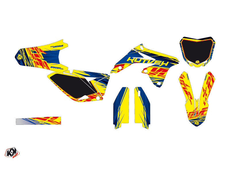 Offer you now for your Suzuki 250 RMZ Dirt Bike a graphic kit on the colors and brand name of ERASER Blue Yellow.