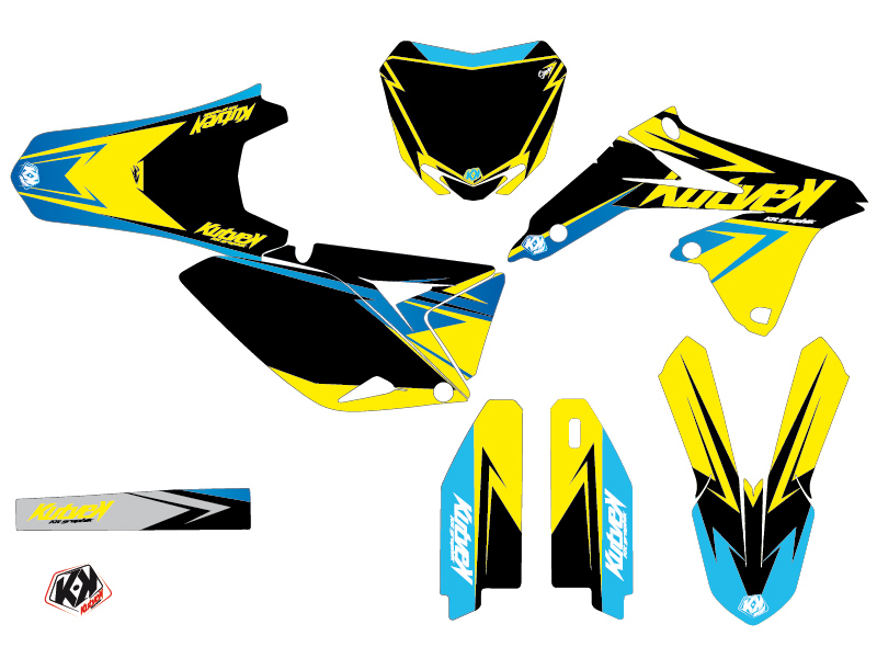 Offer you now for your Suzuki 250 RMZ Dirt Bike a graphic kit on the colors and brand name of STAGE Yellow Blue.
