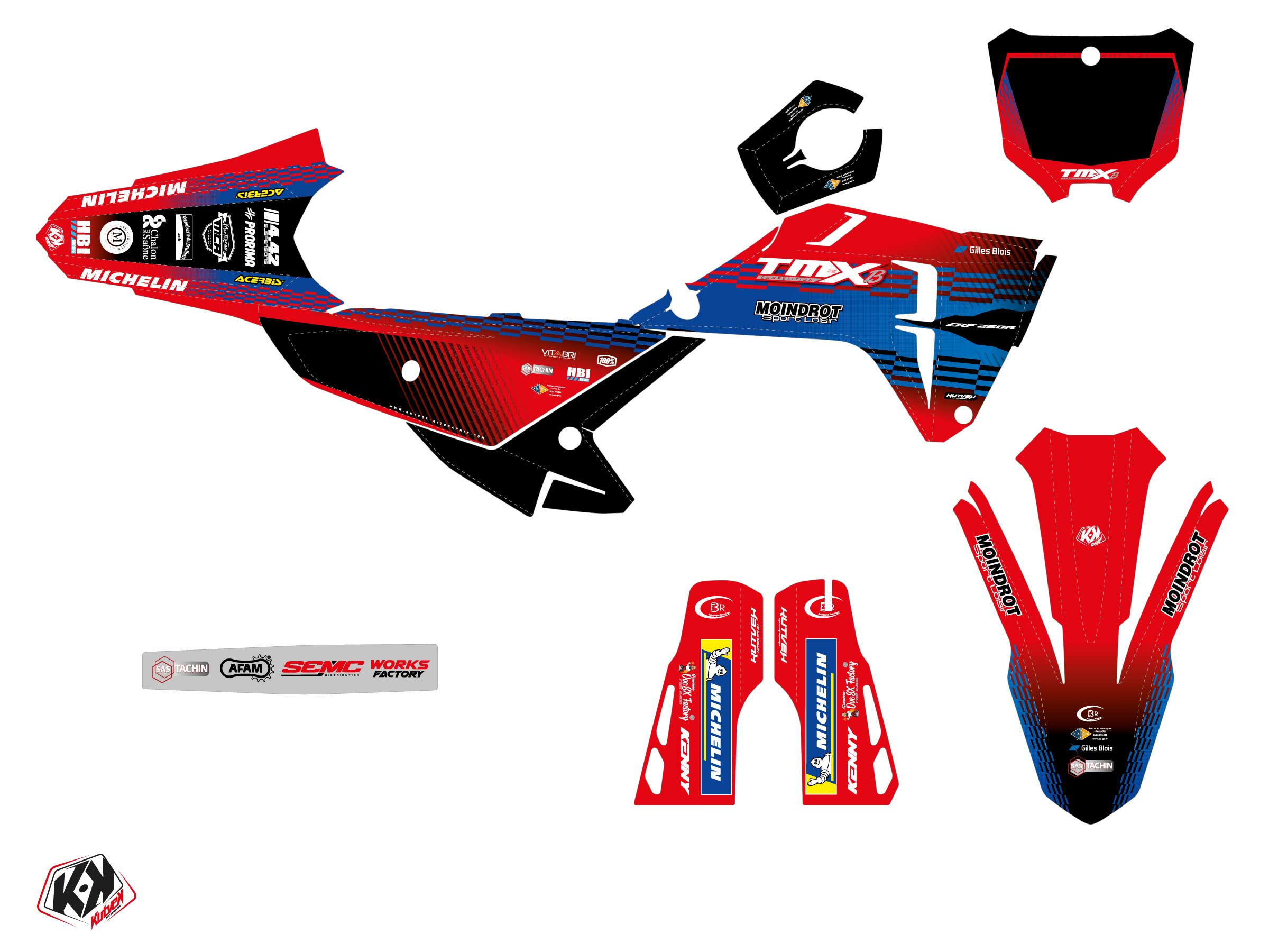 Offer you now for your Dirt Bike HONDA CRF 250 R a graphic kit on the colors of REPLICA TEAM TMX K25 Red-Blue design.