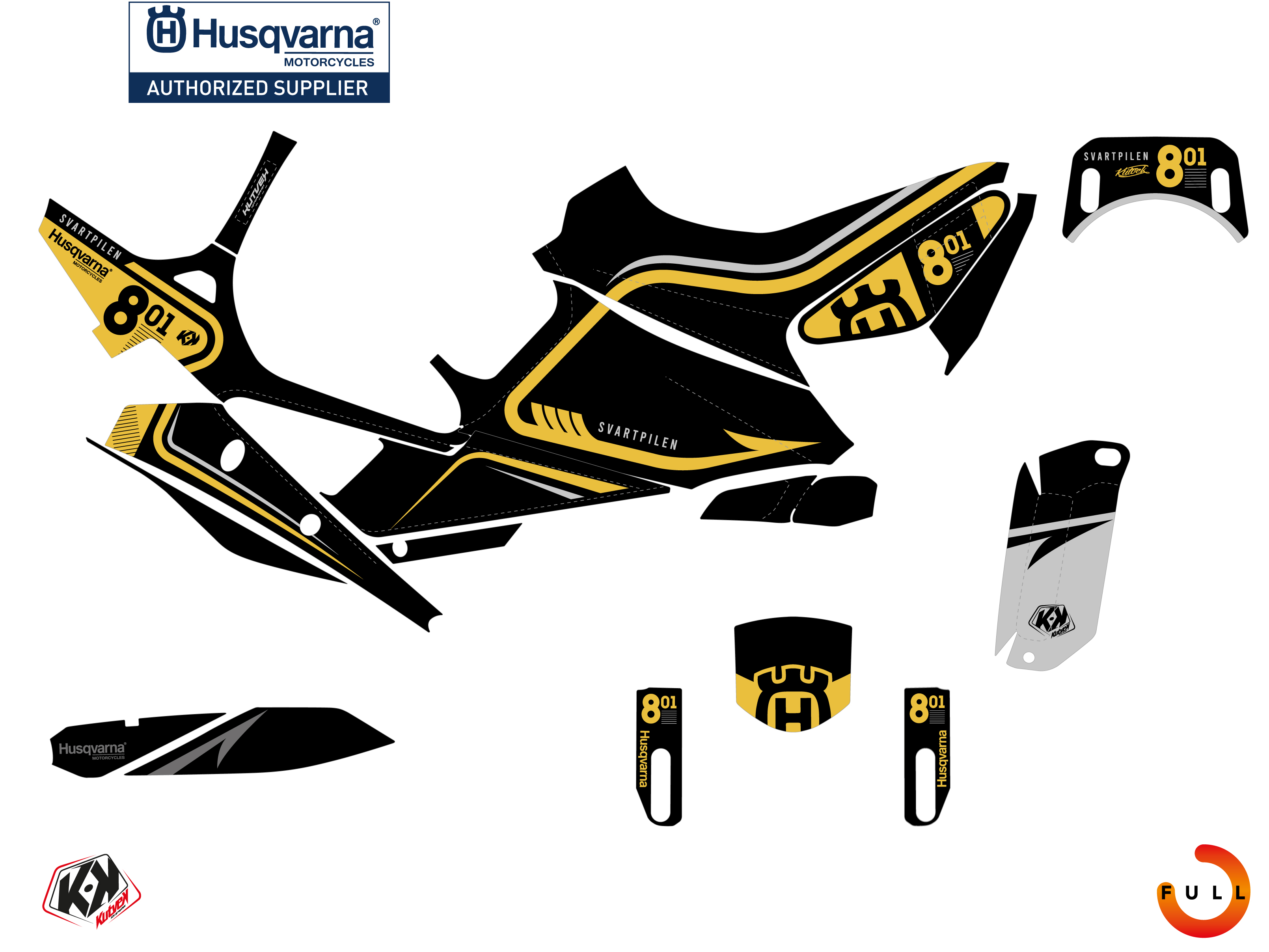 The HUSQVARNA SVARTPILEN 801 graphic kit includes :