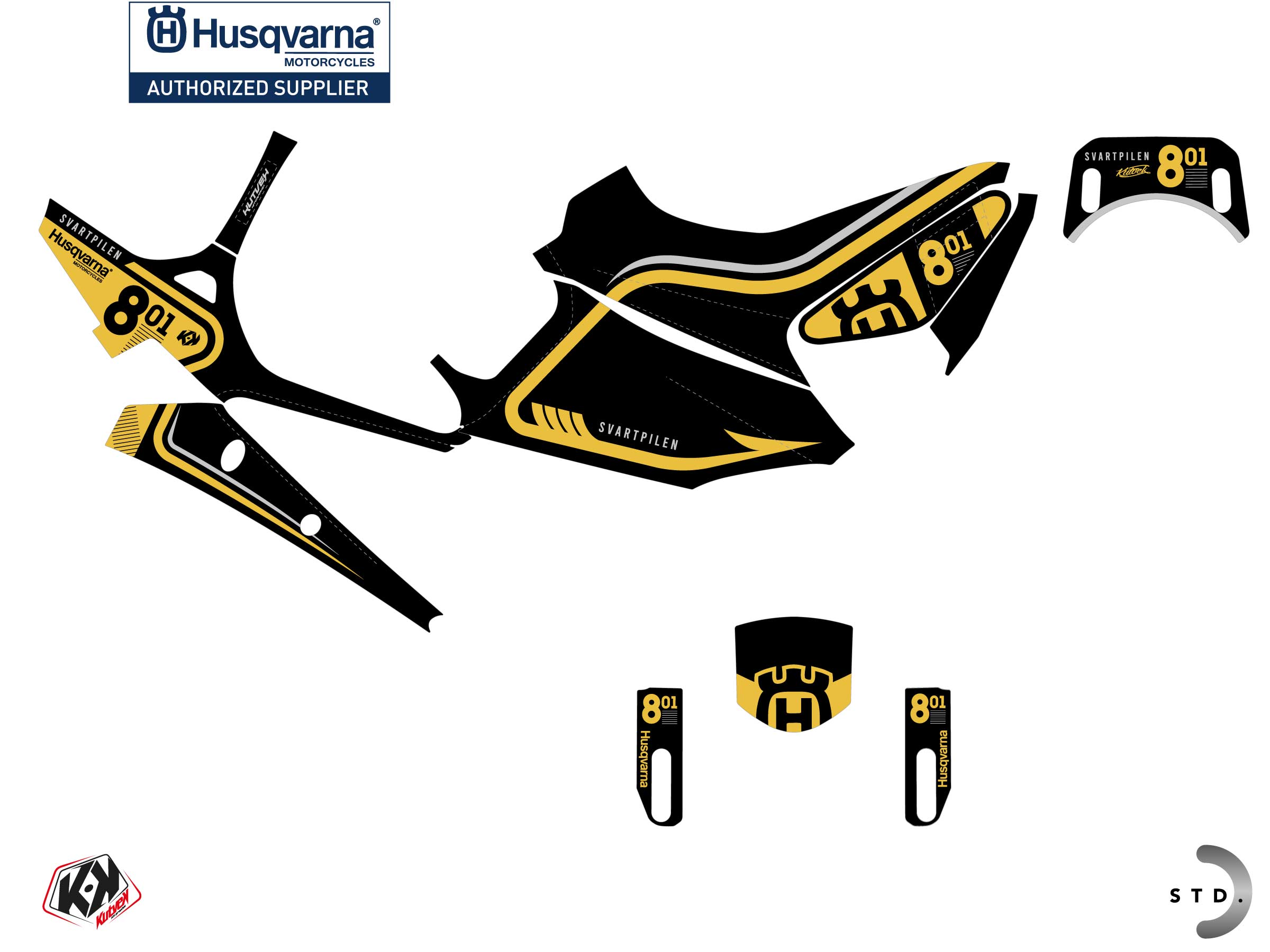 Offer you now for your Street Bike HUSQVARNA SVARTPILEN 801 a graphic kit on the colors of ARROW Gold design.