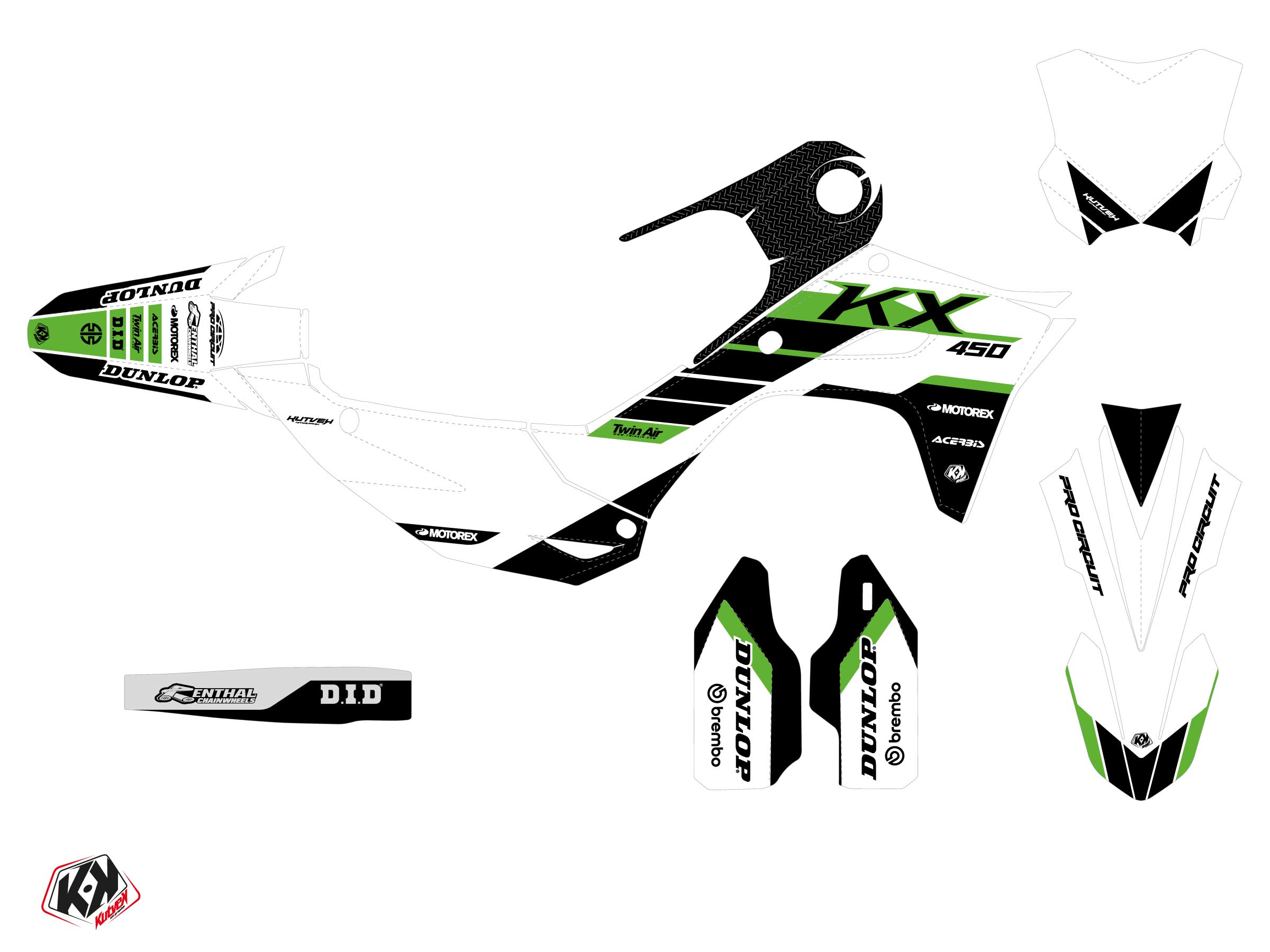 Offer you now for your Dirt Bike KAWASAKI KX 450 F a graphic kit on the colors of ORIGIN K25 White design.