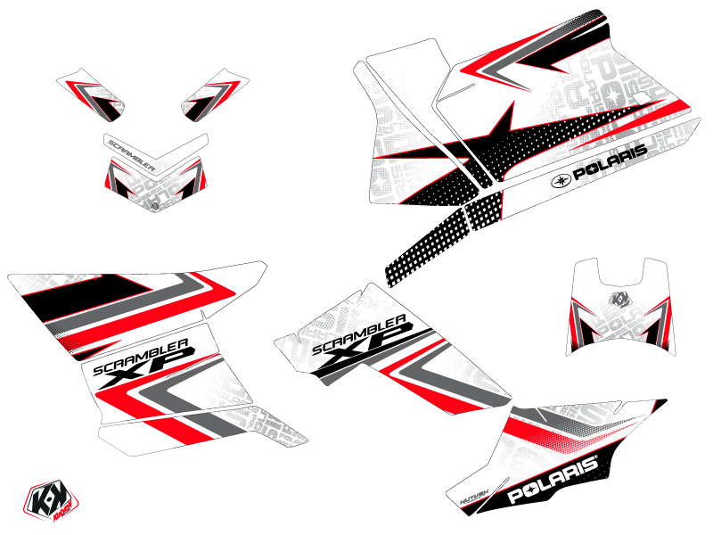 Offrez-vous dès maintenant pour votre Quad Polaris Scrambler 850-1000 XP un kit déco aux couleurs de la gamme ROCK Blanc Rouge.